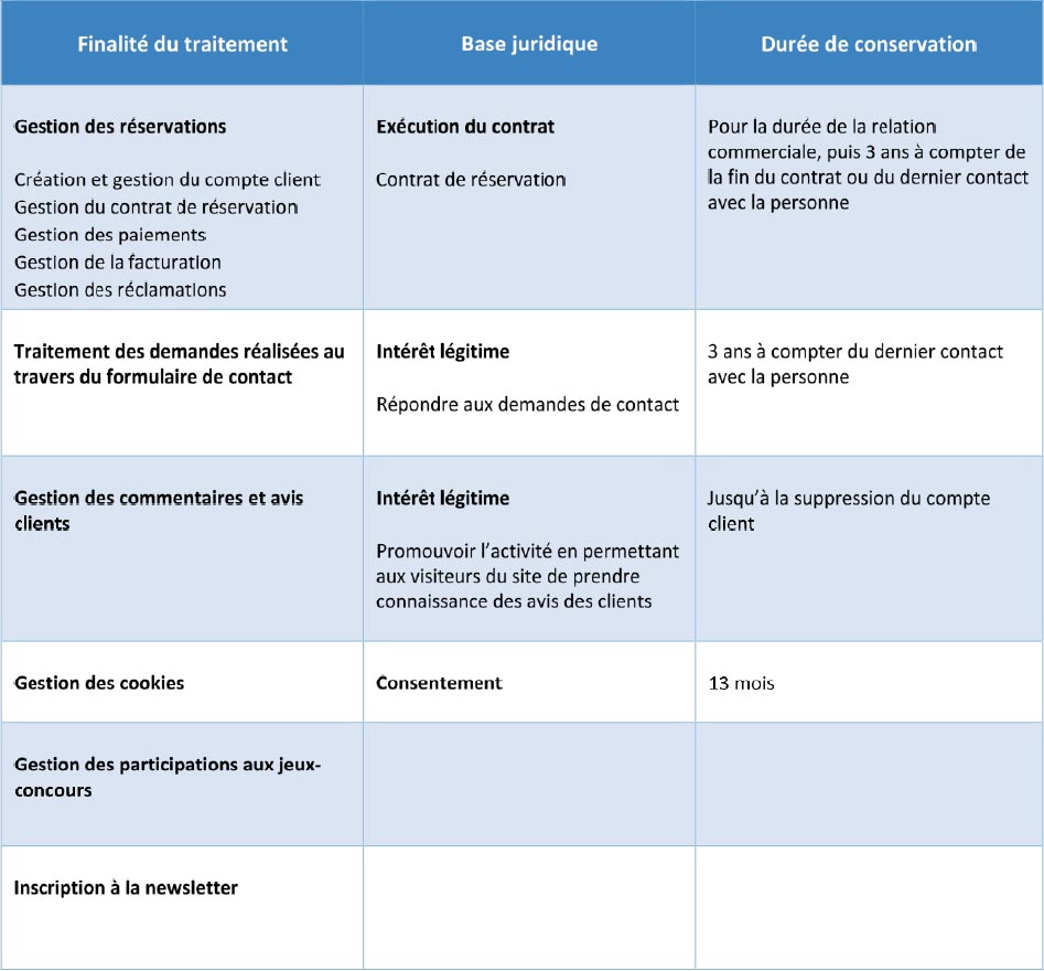 Nous traitons des données personnelles telles que vos nom, prénom, date de naissance, adresse postale, adresse e-mail, numéro de téléphone, moyens de paiement, historique de réservations.